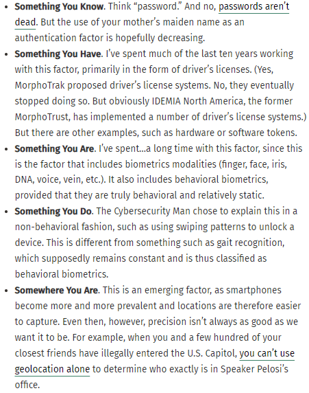 All of these different biometric modalities got people excited. Some people, um, “advanced” the notion that biometrics (something you are) was THE way to identify people, and that passwords were of necessity going to die. Bill Gates predicted the death of the password in 2004, but he wasn’t (and isn’t) the only one to assert this view. Some assert that biometrics are clearly better than passwords. Opponents, however, objected to a reliance on only biometrics because of the ability to spoof biometrics, and because of perceived and actual racial disparities. (See my comments on faulty conclusions, and on the racist methods that people use when they DON’T use computerized facial recognition.)