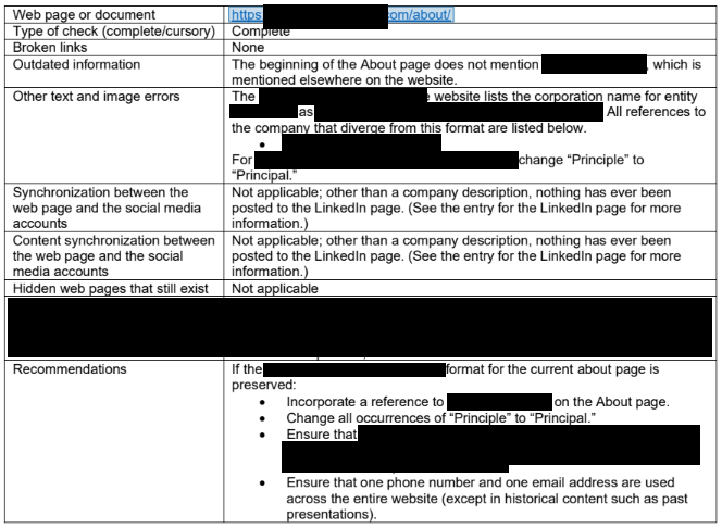 How do I provide the service? I not only analyze every page on your business website, but also analyze every social media account associated with your business (and, if you choose, your personal social media accounts also).