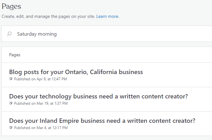 Oh, and there are three other pages that mention the words “Saturday morning” (as in booking a Saturday morning meeting with me). I have to fix those also.