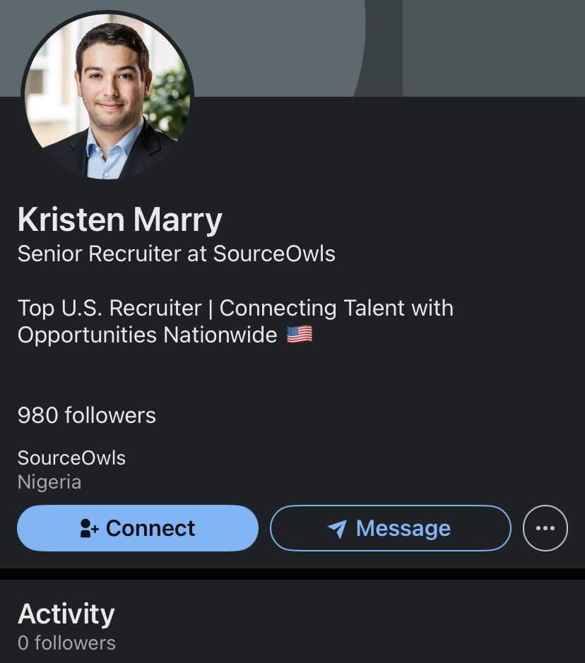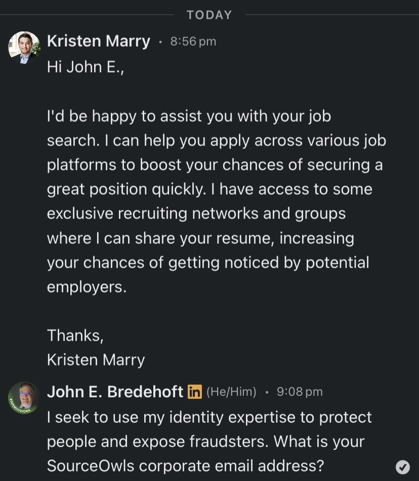 Seriously, LinkedIn is filled with people who falsely claim that they work for SourceOwls, Korn Ferry, Kelly…even Amazon. And a verified profile doesn’t offer protection, because a verified profile only confirms identity—not employment.