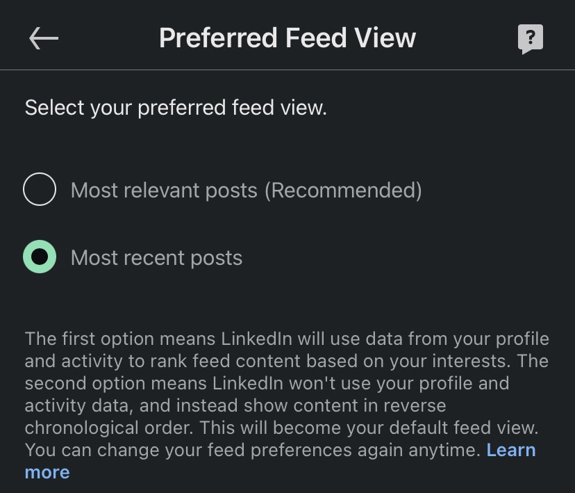 When I returned to LinkedIn to share a LinkedIn version of this post, my preferred feed view had been reset to “most relevant.”