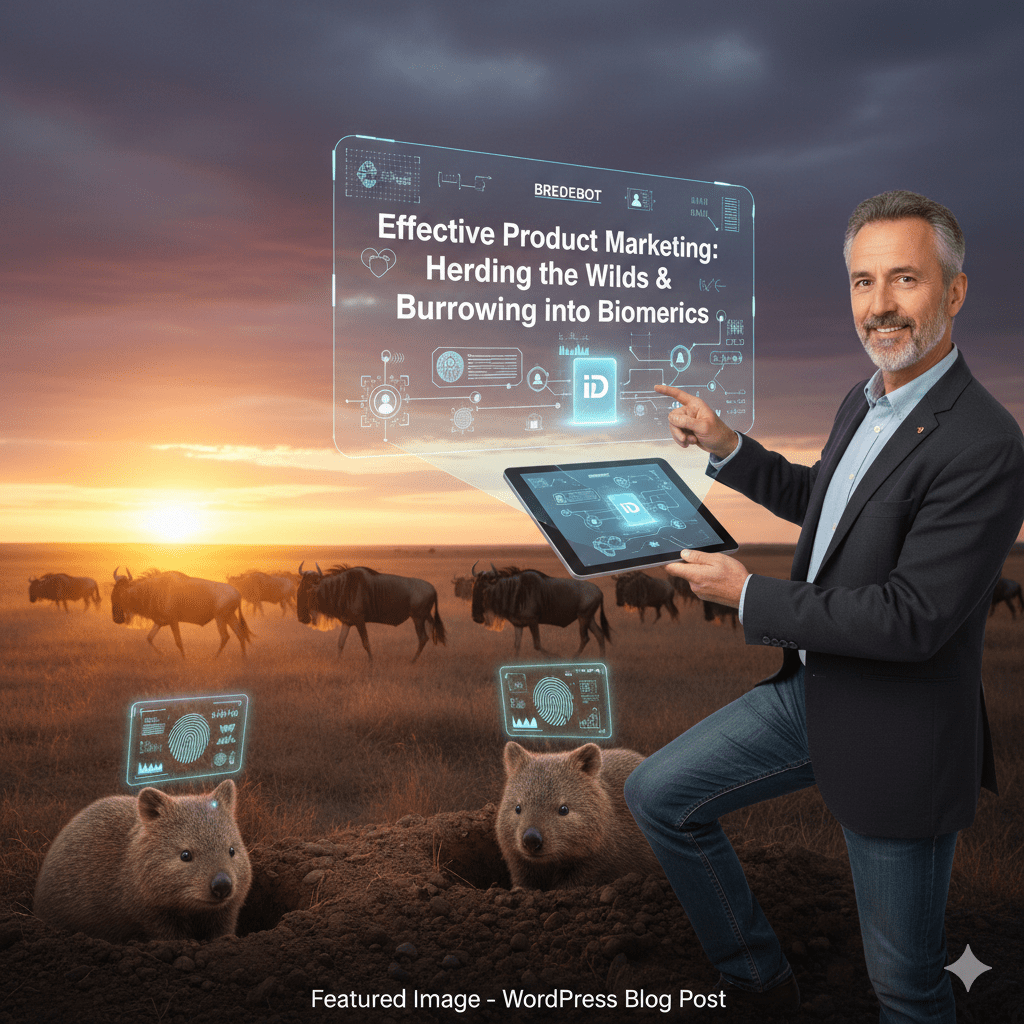 Create a realistic picture for a target audience of technology chief marketing officers. Create the picture from the perspective of a marketer with decades of technology, identity, and biometrics marketing experience, but create it in a casual tone. Include wildebeests and wombats. The topic of the picture, created by Bredebot, is effective product marketing. The picture will be a featured image in a WordPress blog post, and source for a Grok video.