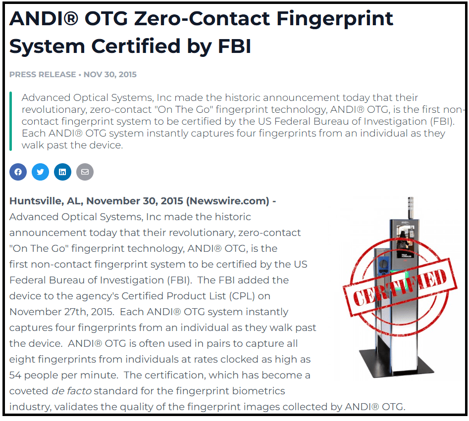 Huntsville, AL, November 30, 2015 (Newswire.com) –​​​​​​Advanced Optical Systems, Inc made the historic announcement today that their revolutionary, zero-contact “On The Go” fingerprint technology, ANDI® OTG, is the first non-contact fingerprint system to be certified by the US Federal Bureau of Investigation (FBI).  The FBI added the device to the agency’s Certified Product List (CPL) on November 27th, 2015.”