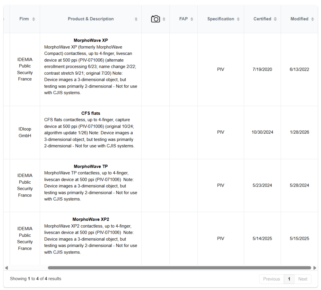 “CFS flats contactless, up to 4-finger, capture device at 500 ppi (PIV-071006) (original 10/24; algorithm update 1/26) Note: Device images a 3-dimensional object, but testing was primarily 2-dimensional – Not for use with CJIS systems.”