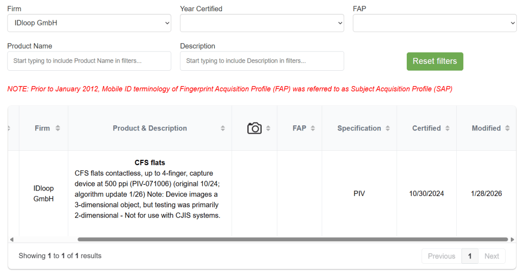 If you do so, you can find certifications from 2019 and earlier for products from Advanced Optical Systems (October 2015 May 2017), Safran Morpho (November 2015, under the original name “Finger On The Fly”), and Thales (May 2019). All years BEFORE the IDloop product.