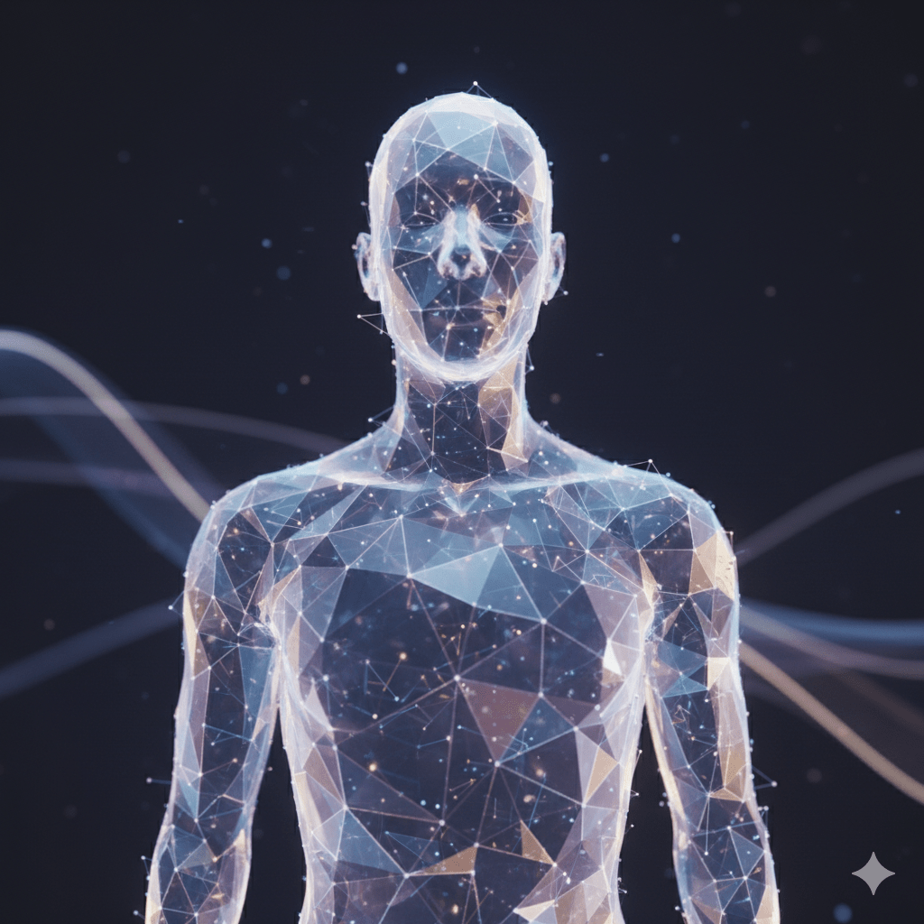 “Abstract 3D render of a human silhouette made of shimmering frosted glass, iridescent light refracting through, symbolizing secure data encryption and zero-knowledge proofs, elegant and high-end.”