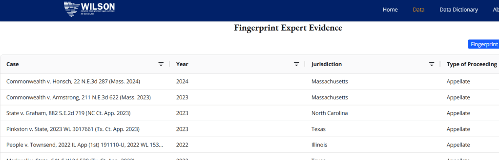 Mike Bowers shared a release from the Wilson Center for Science and Justice at Duke Law, “New Database Documents a Century of Court Decisions on Forensic Expert Evidence Testimony.”