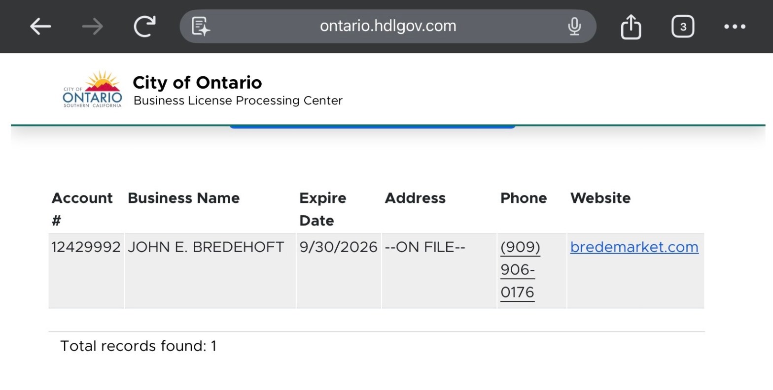 Yes, Bredemarket is Licensed With the City of Ontario
