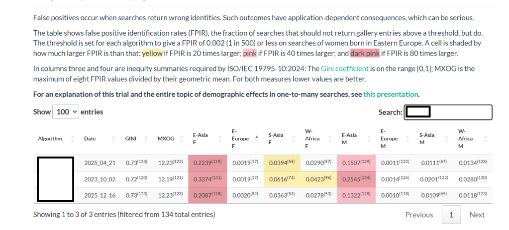 - The third algorithm, submitted in 2025, had lower FPIR values for these populations and thus no yellow color coding.