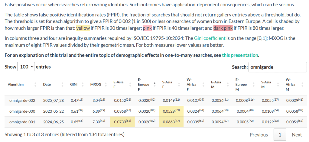 - Omnigarde’s first two algorithms, submitted in 2023 and 2024, exhibited high FPIR values for south Asian females, and the second algorithm also exhibited a high FPIR value for east Asian females. See the color coding.