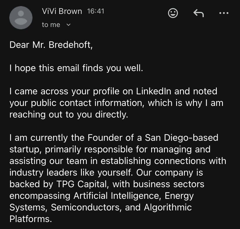 “I am currently the Founder of a San Diego-based startup, primarily responsible for managing and assisting our team in establishing connections with industry leaders like yourself. Our company is backed by TPG Capital, with business sectors encompassing Artificial Intelligence, Energy Systems, Semiconductors, and Algorithmic Platforms.”
