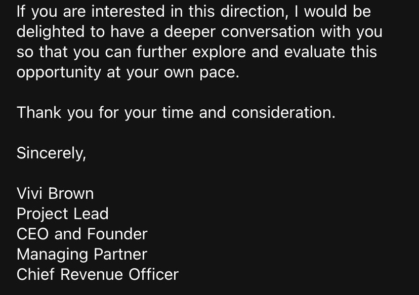 Translating corporate-speak to English, apparently ViVi Contras Belleville Brown 429 wants to chat about a Global Strategic Operations Partner position. And to get to know me via a deeper conversation.