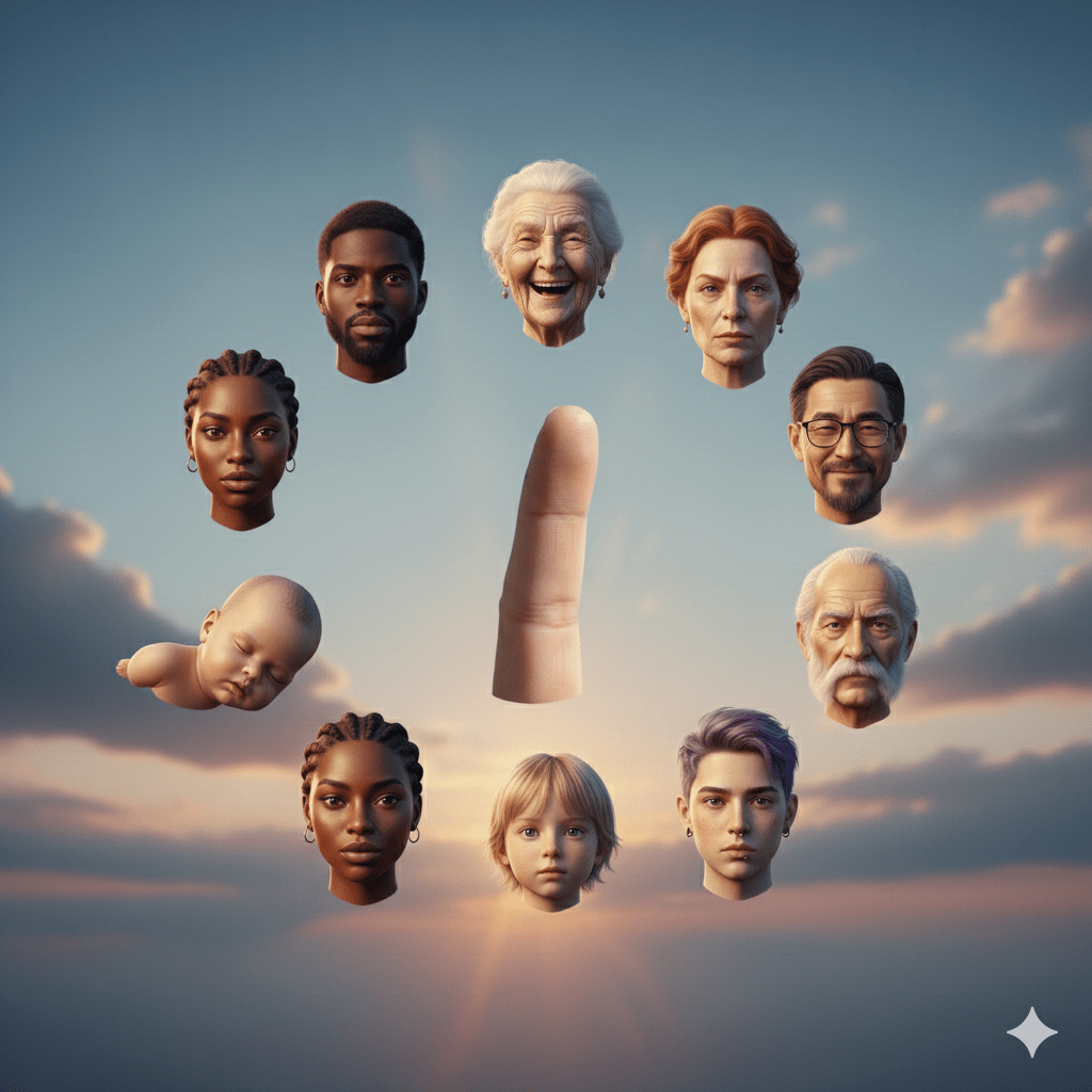 Imagine an alternative universe in which a single human body had ten (different) faces and only one finger.