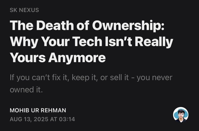 From “The Death of Ownership: Why Your Tech Isn’t Really Yours Anymore” by Mohib Ur Rehman (SK Nexus, Substack)