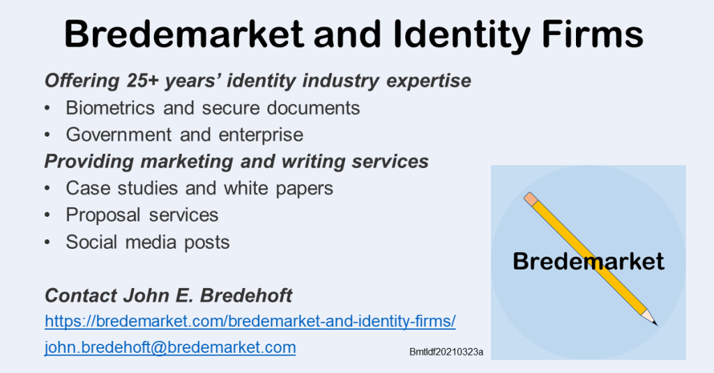 Here are a few examples of services that I have provided to identity firms under the Bredemarket banner as a biometric proposal writing expert, a biometric content marketing expert, and an expert in other areas of biometric writing.
