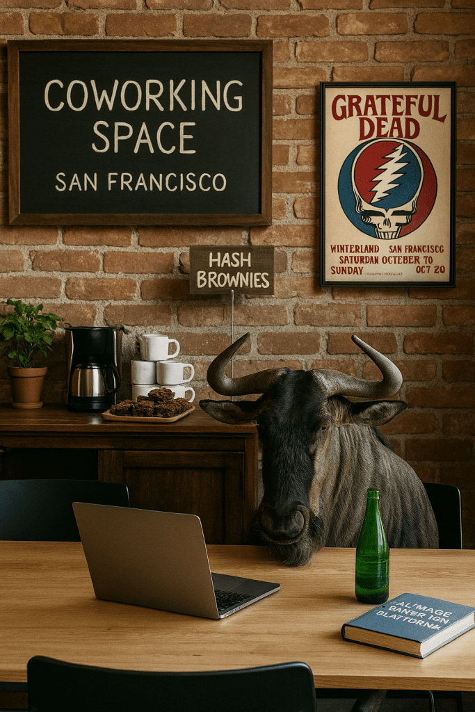 Create a realistic photograph of a coworking space in San Francisco in which coffee and hash brownies are available to the guests. A wildebeest, who is only partaking in a green bottle of sparkling water, is sitting at a laptop. A book next to the wildebeest is entitled “AI Image Generation Platforms.” There is a Grateful Dead poster on the brick wall behind the wildebeest, next to the hash brownies.