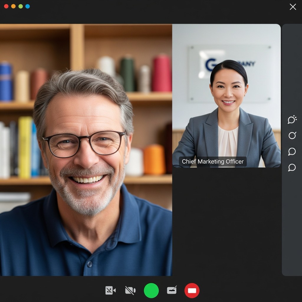 At the scheduled time she joins the meeting from her laptop on her office desk and sees John on the screen. John is a middle-aged Caucasian man with graying hair. He is wearing wire-rimmed glasses with a double bridge. He has a broad smile, with visible lines around his eyes and mouth. His eyes are brown and appear to be looking directly at the camera. He is wearing a dark blue collared shirt. While his background is blurred, he appears to be in a room inside his home, with a bookcase and craft materials in the background.