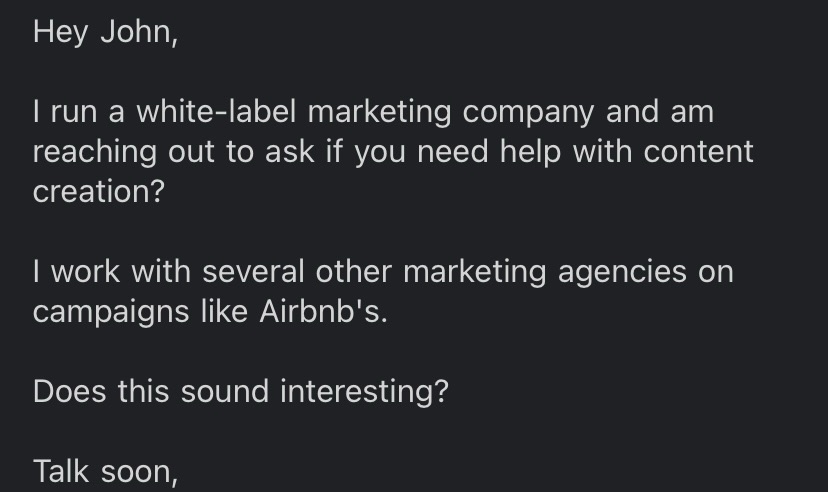 I run a white-label marketing company and am reaching out to ask if you need help with content creation? I work with several other marketing agencies on campaigns like Airbnb’s.