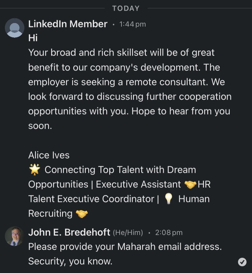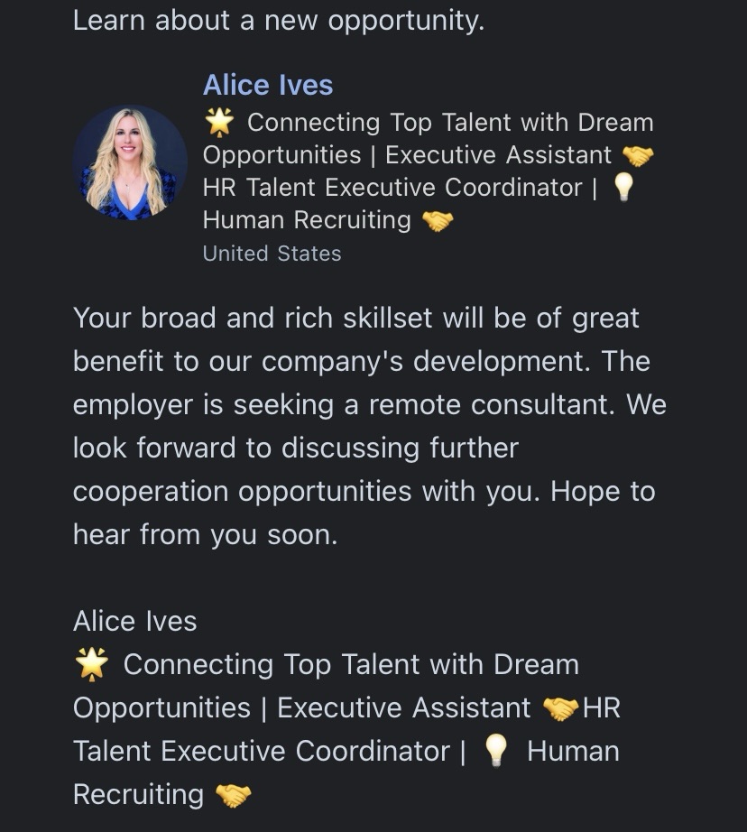 This afternoon I received an email and a LinkedIn InMail from “Alice Ives,” purportedly with Maharah according to her profile. She wanted to tell me about an opportunity.