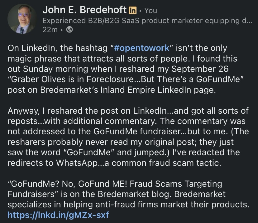 On LinkedIn, the hashtag “#opentowork” isn’t the only magic phrase that attracts all sorts of people. I found this out Sunday morning when I reshared my September 26 “Graber Olives is in Foreclosure…But There’s a GoFundMe” post on Bredemarket’s Inland Empire LinkedIn page.