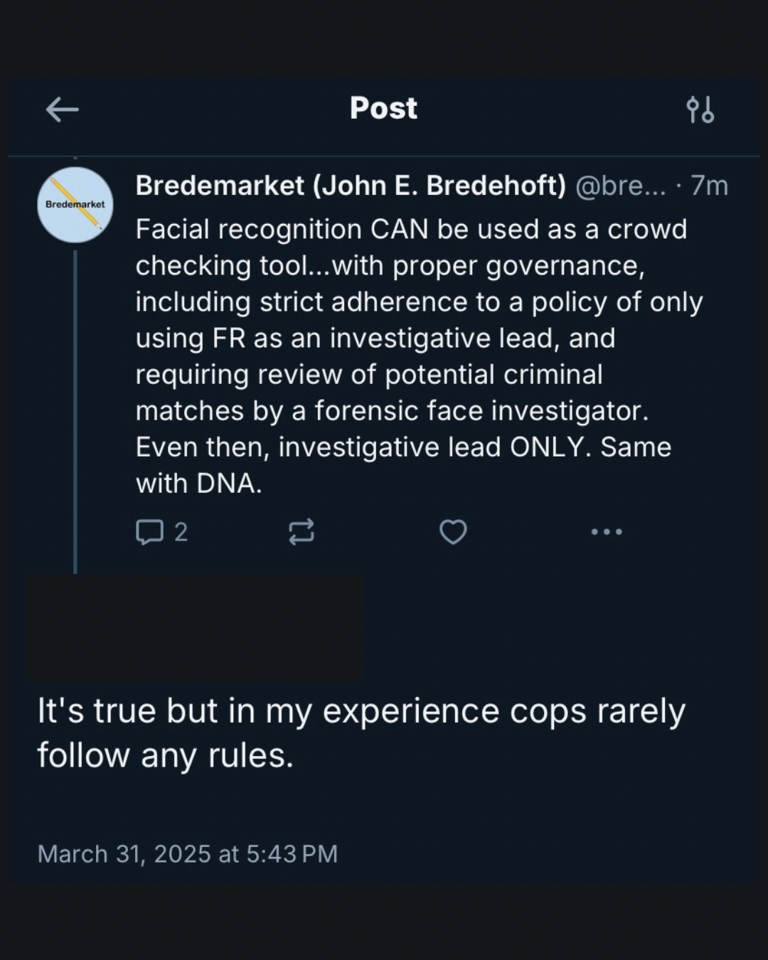 “Facial recognition CAN be used as a crowd checking tool…with proper governance, including strict adherence to a policy of only using FR as an investigative lead, and requiring review of potential criminal matches by a forensic face investigator. Even then, investigative lead ONLY. Same with DNA.”