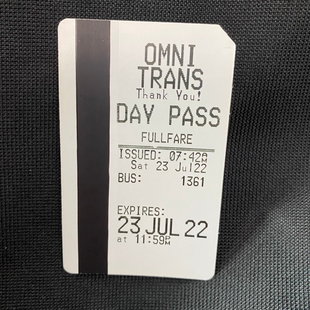 Assume the most challenging scenario, in which Omnitrans knows nothing about the person who purchases a 31-day pass. The person pays in cash and is wearing a face mask and sunglasses throughout the entire transaction. Therefore, the only identity information associated with the pass is the location where the pass was purchased, the date/time it was purchased, and some type of pass identification number. For this example, we’ll assume the pass number is 12345.