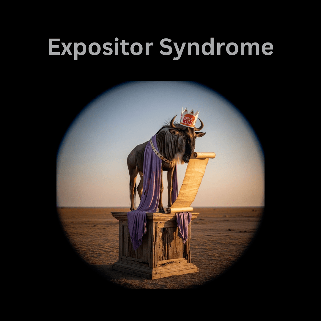 “Expositor Syndrome is a hypothetical, non-clinical psychological pattern characterized by an overwhelming and often compulsive urge to explain, clarify, or elaborate upon concepts, ideas, or events, even when such detailed exposition is unsolicited, unnecessary, or redundant. Individuals exhibiting Expositor Syndrome experience a profound discomfort or anxiety if they perceive a potential for misunderstanding or an unstated implication, feeling an internal pressure to “lay bare” all facets of a topic.