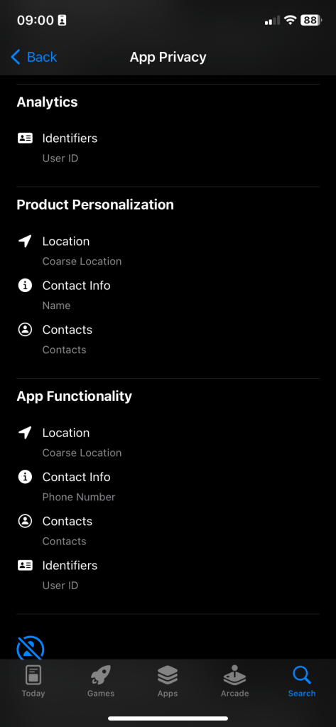 First, Worldcoin collects data when you download the World App. The data that is collected by the iOS version of the World App includes a user ID, the user’s coarse location, a name, contacts, and a phone number. I’ll admit that the collection of contacts is a little odd, but let’s see what happens to that data later in the process.