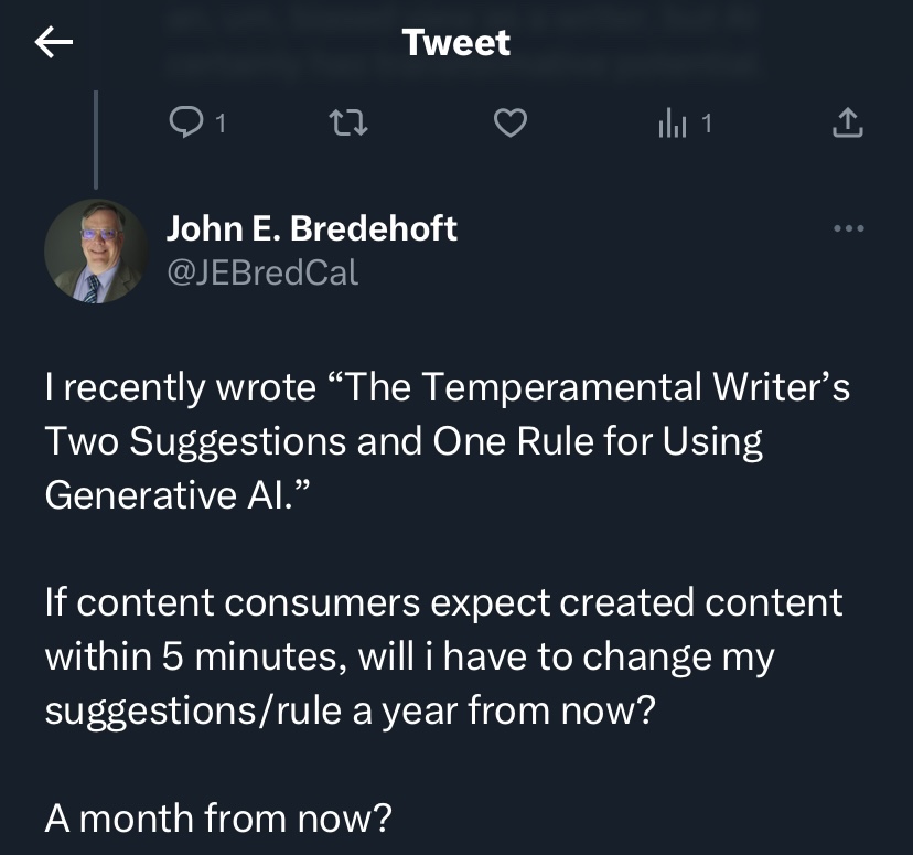 And as long as I disclose to a potential Bredemarket client (or an employer) my three suggestions (whoops, two suggestions and one rule) for using generative AI, there should be no ethical or legal problem in using a tool. In a sense it’s like using online grammar correction tools, or a book like a dictionary or thesaurus.